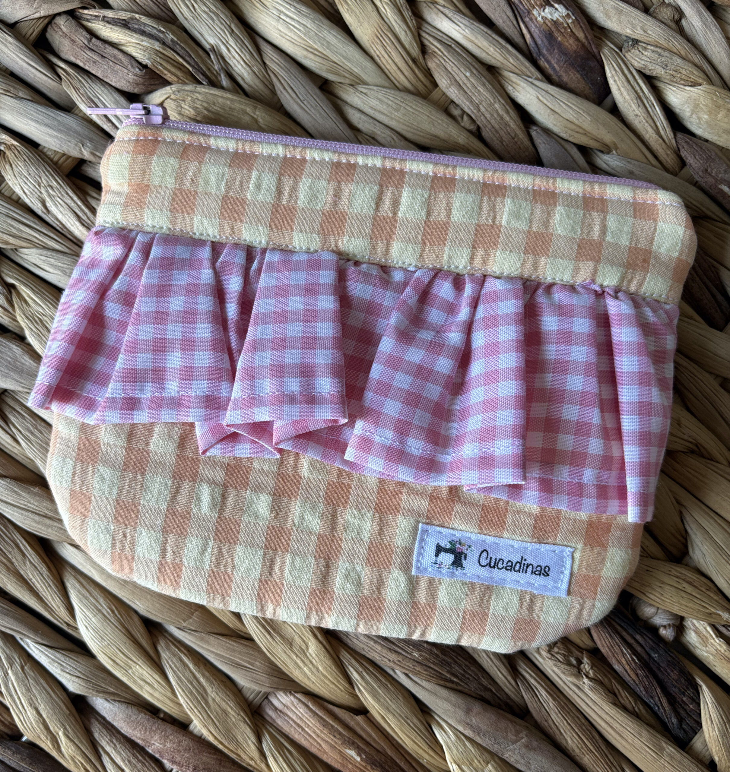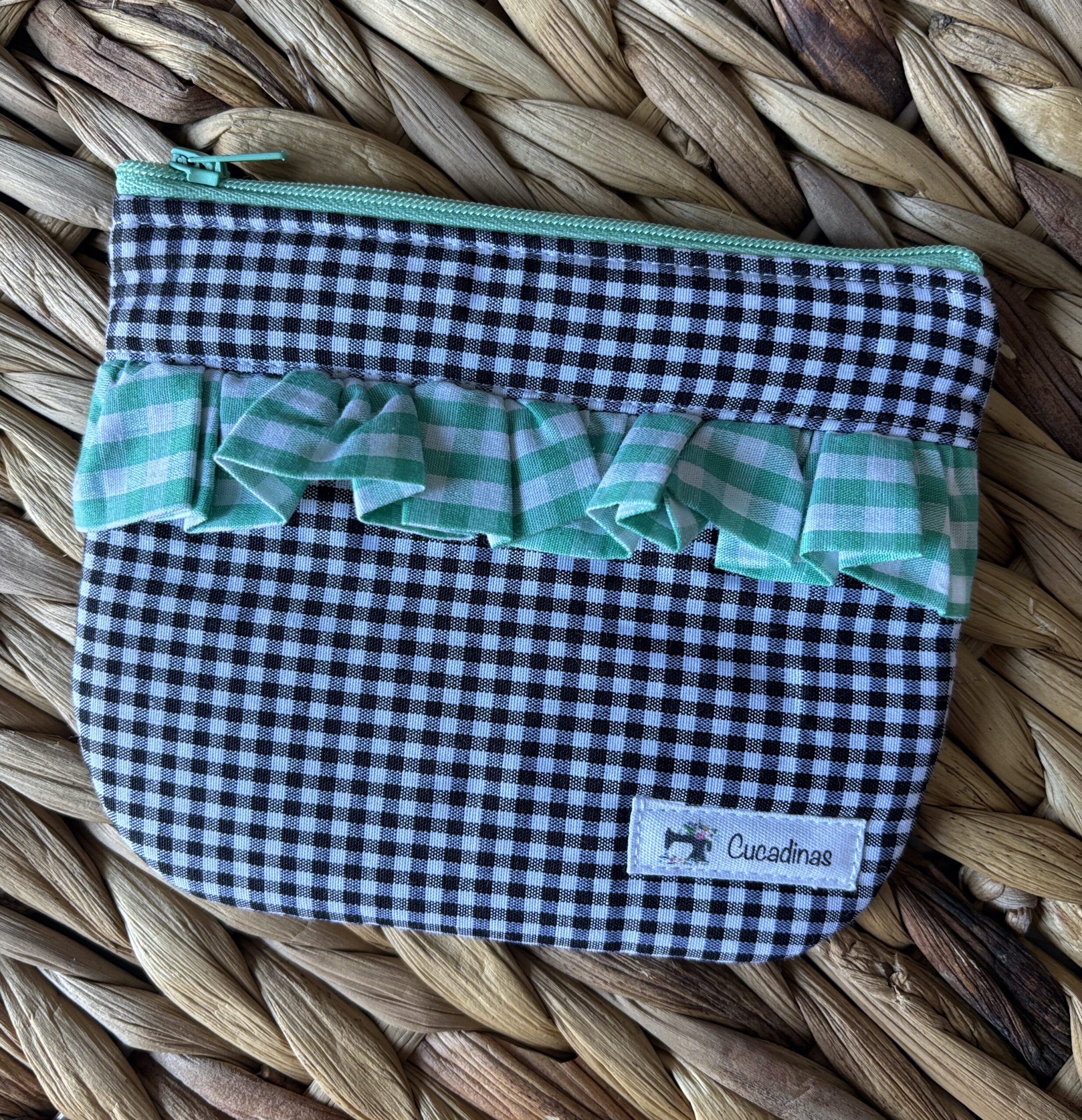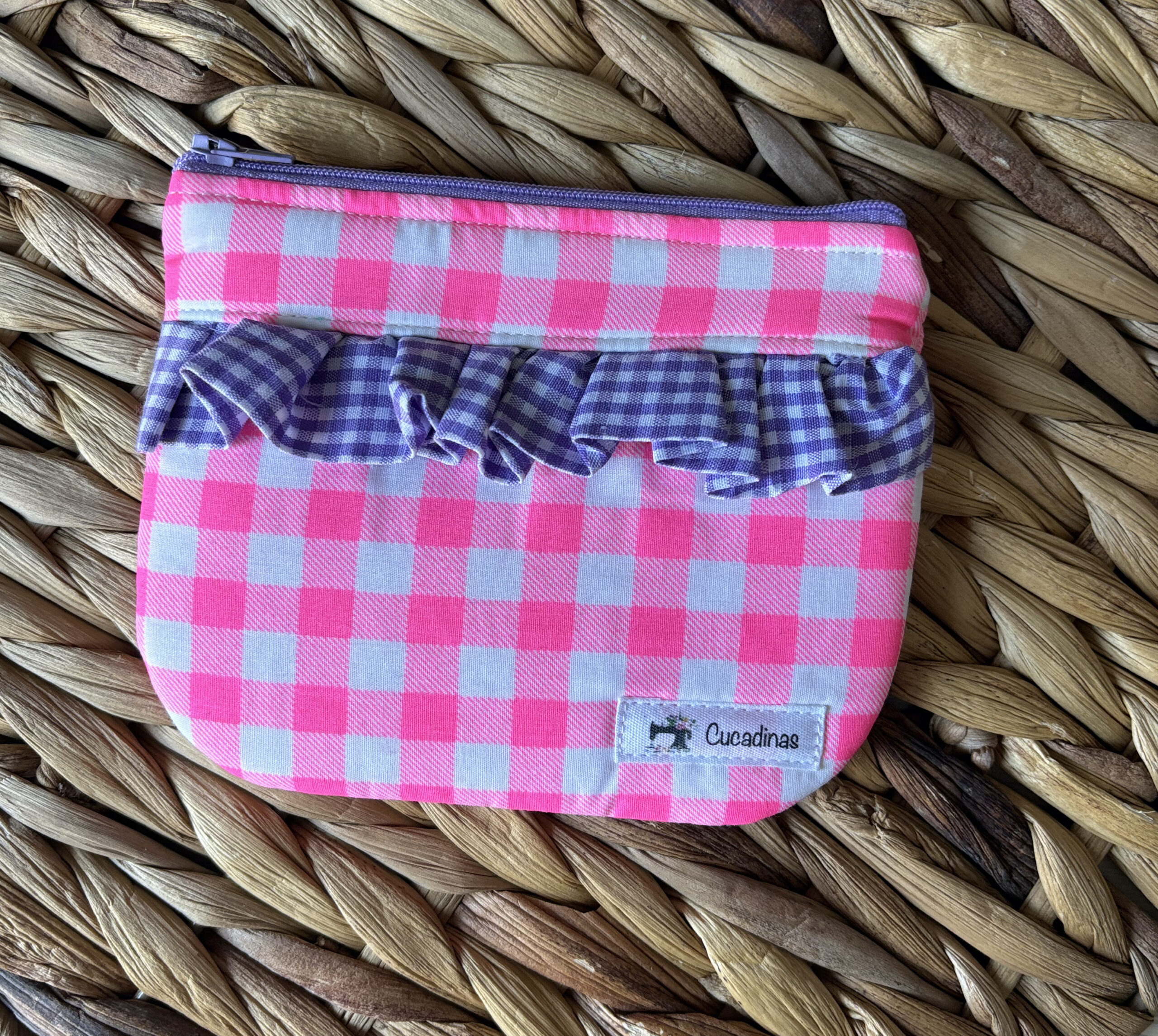 El Monedero Olé es pequeño, práctico y lleno de personalidad. Hecho a mano en algodón con estampado vichy y un divertido volante, es perfecto para tus monedas, llaves u objetos pequeños.