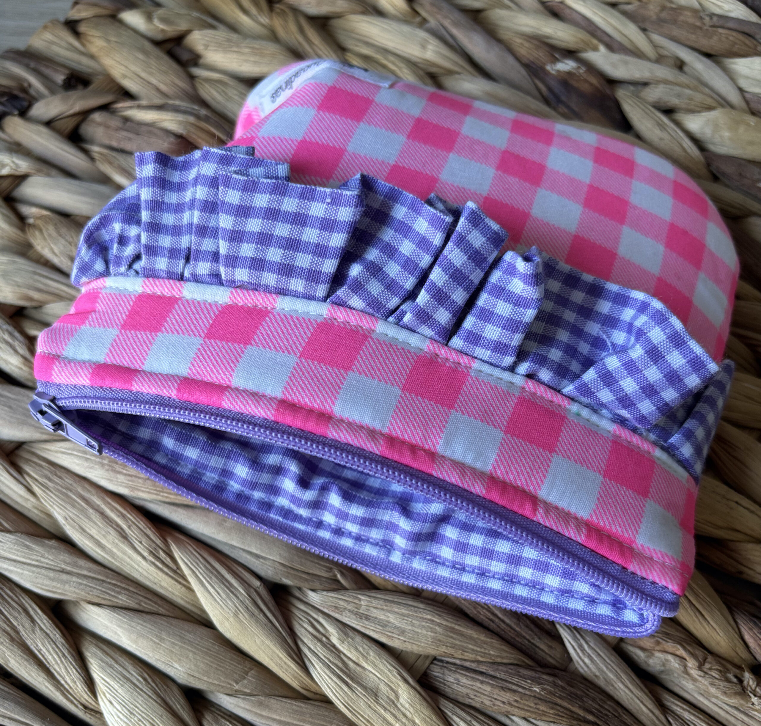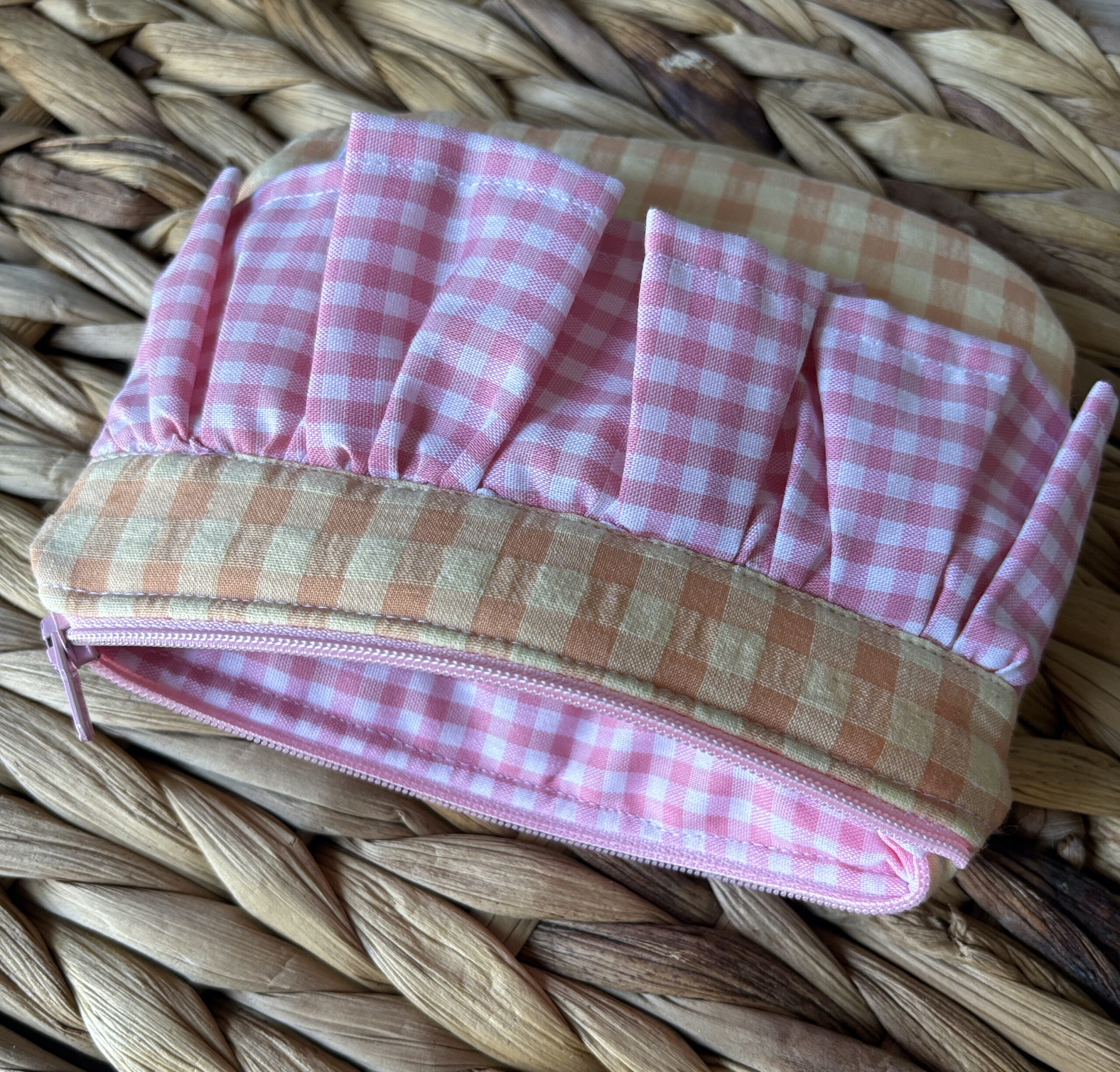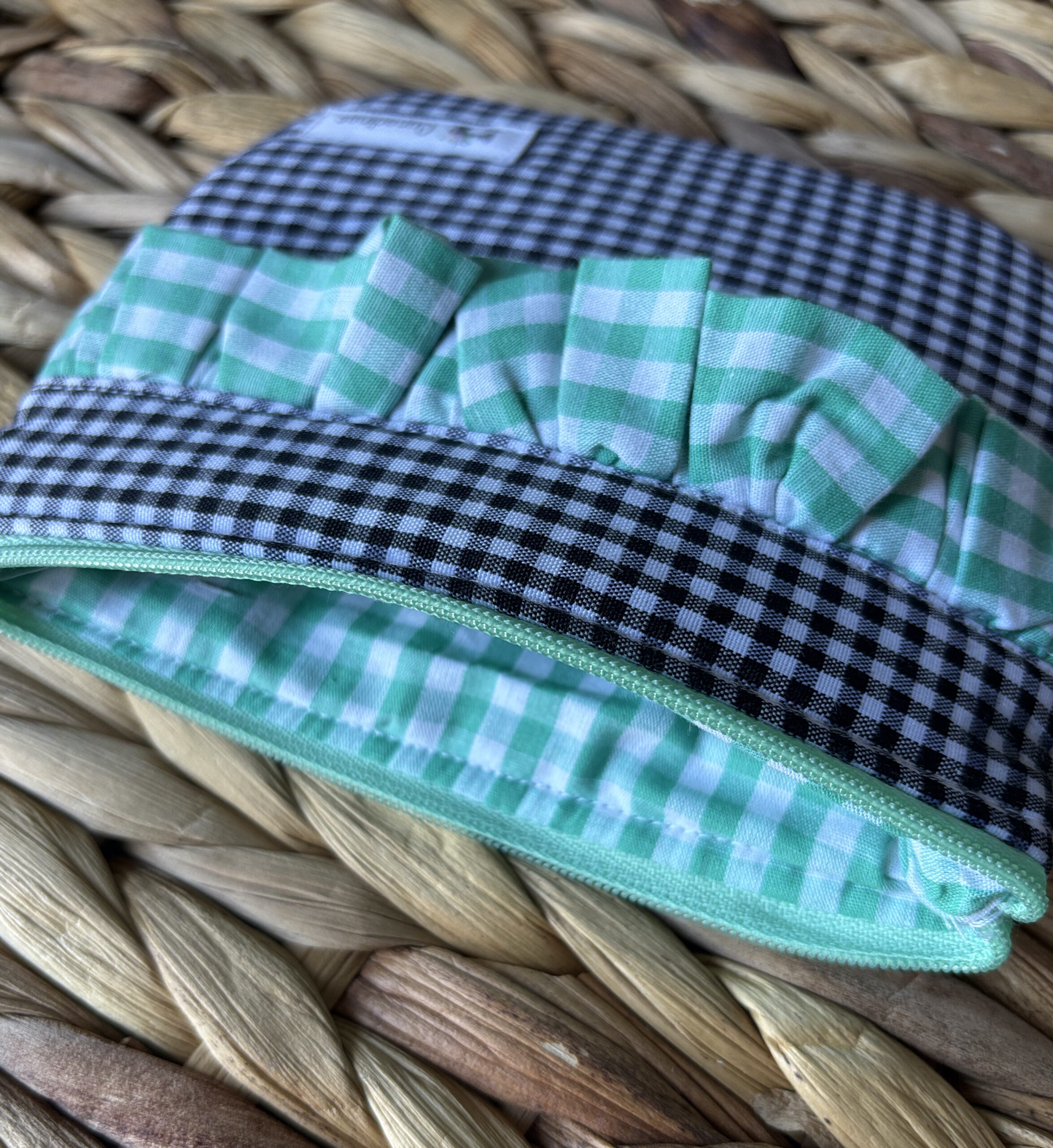 El Monedero Olé es pequeño, práctico y lleno de personalidad. Hecho a mano en algodón con estampado vichy y un divertido volante, es perfecto para tus monedas, llaves u objetos pequeños.
